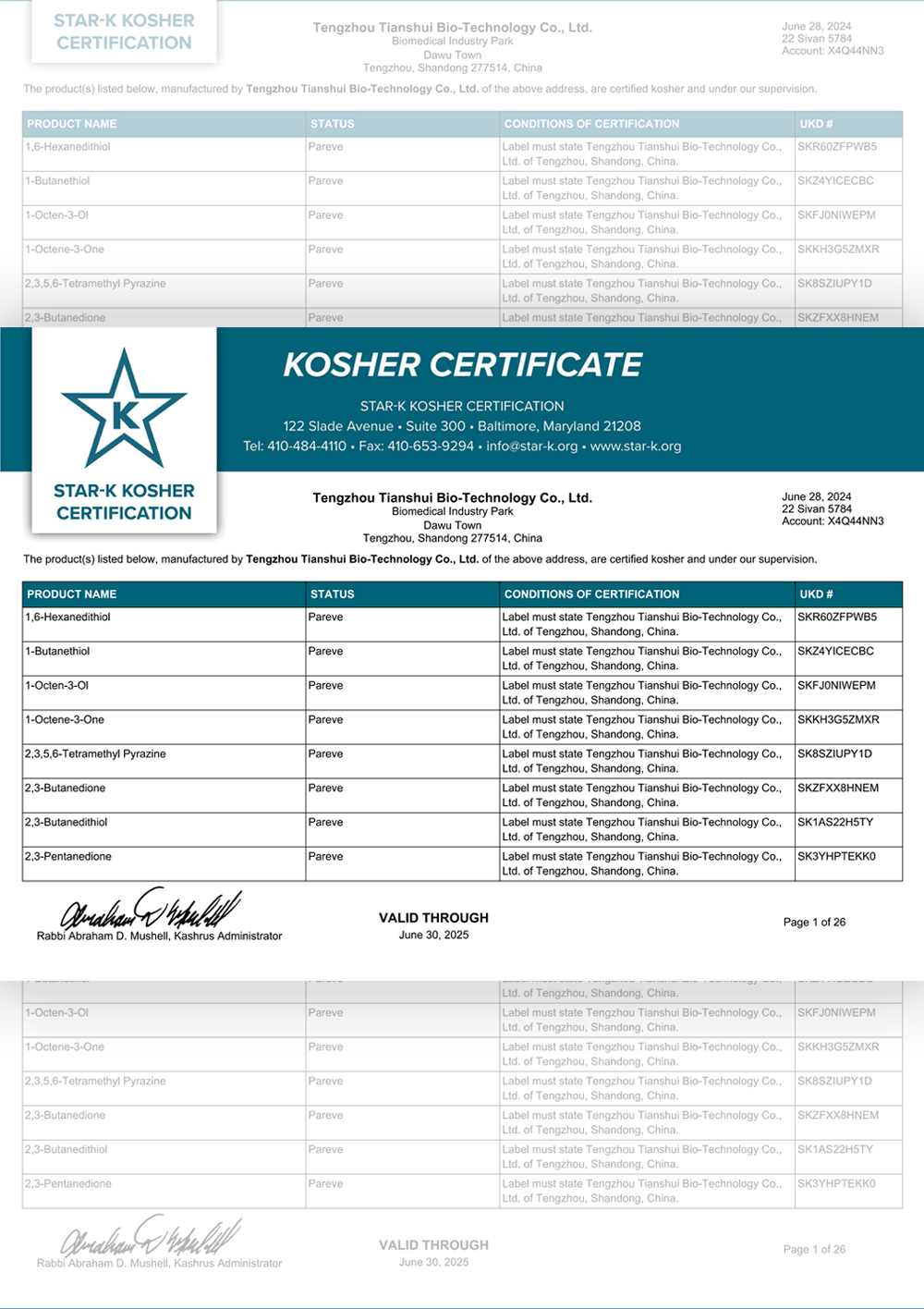 滕州市天水生物科技有限公司成立于2011年9月,是目前國內(nèi)雜環(huán)類合成食品香料、日化香料和醫(yī)藥中間體生產(chǎn)經(jīng)營的綜合性企業(yè)。坐落于山東省滕州市生物醫(yī)藥產(chǎn)業(yè)基地,總投資5000余萬元,占地面積約30000平方米,員工百余人。公司先后被評(píng)為高新技術(shù)企業(yè)、專精特新中小企業(yè)、科技型中小企業(yè),建有市級(jí)重點(diǎn)實(shí)驗(yàn)室1處,并先后獲得ISO9001質(zhì)量體系認(rèn)證、ISO22000食品安全體系認(rèn)證、kosher認(rèn)證和Halal認(rèn)證。是香精香料及食品配料協(xié)會(huì)會(huì)員單位及滕州市中小企業(yè)協(xié)會(huì)理事單位。